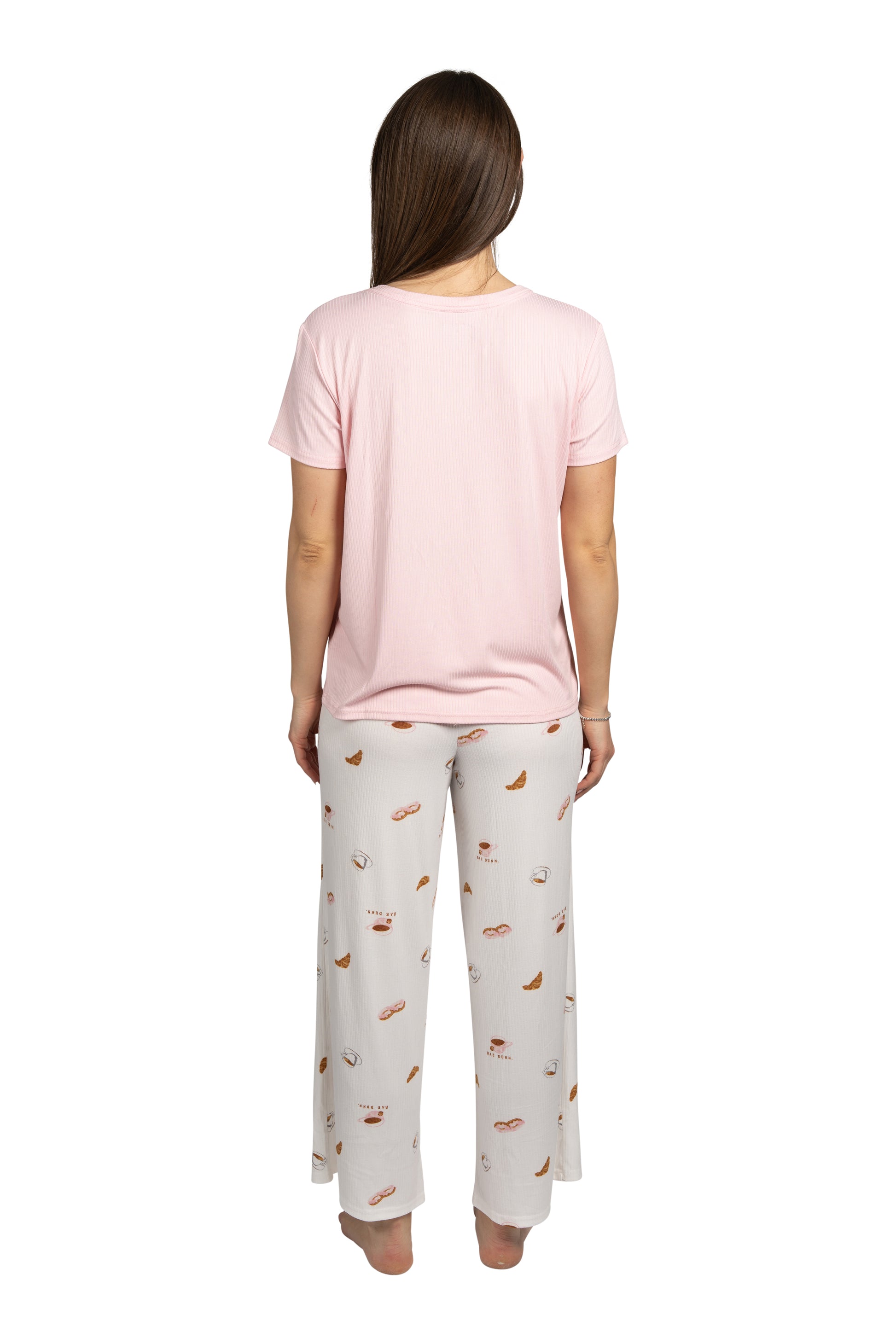 Women's "BREAKFAST IN BED" 2-Piece Short Sleeve Top and Wide Leg Ribbed Pants Pajama Set